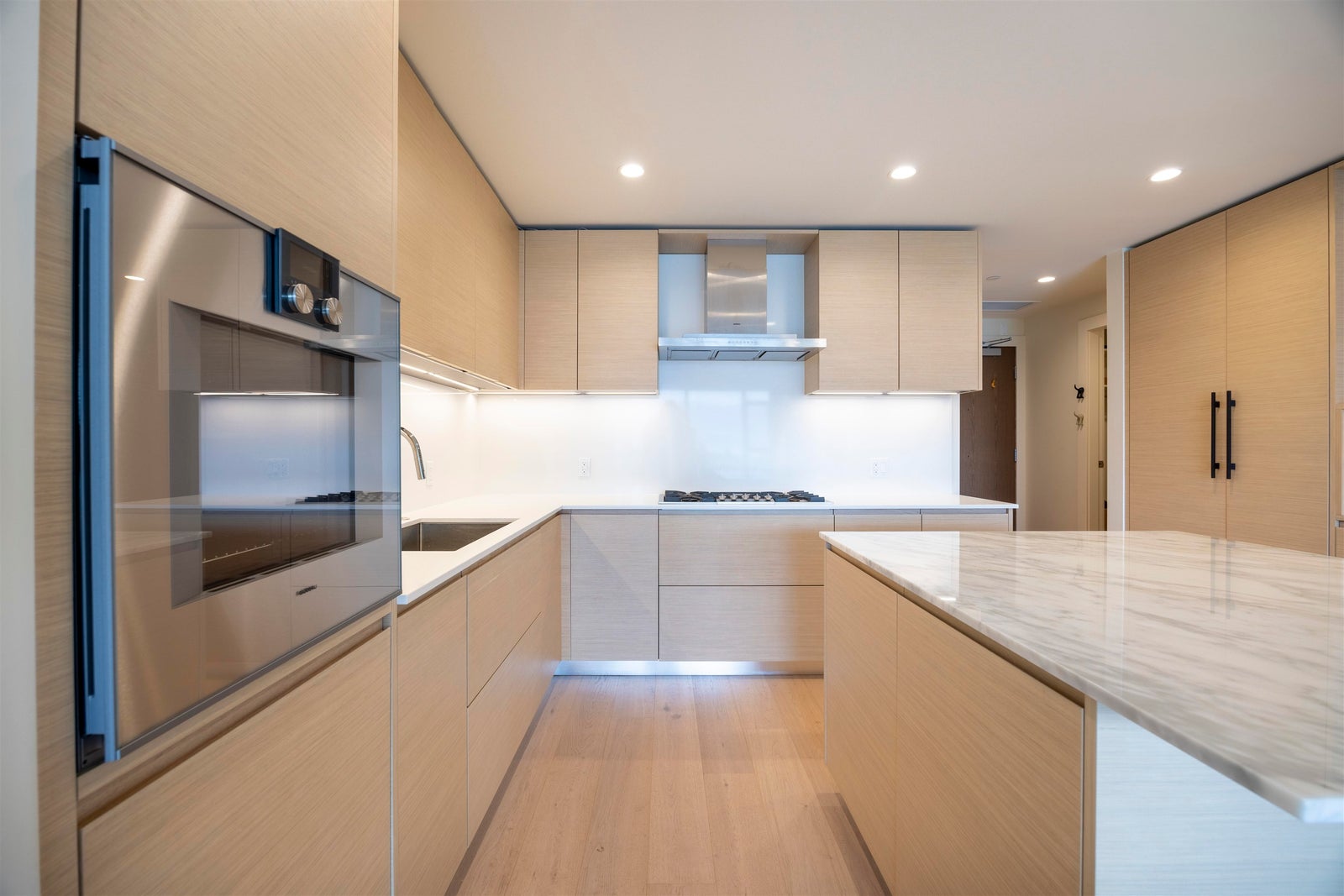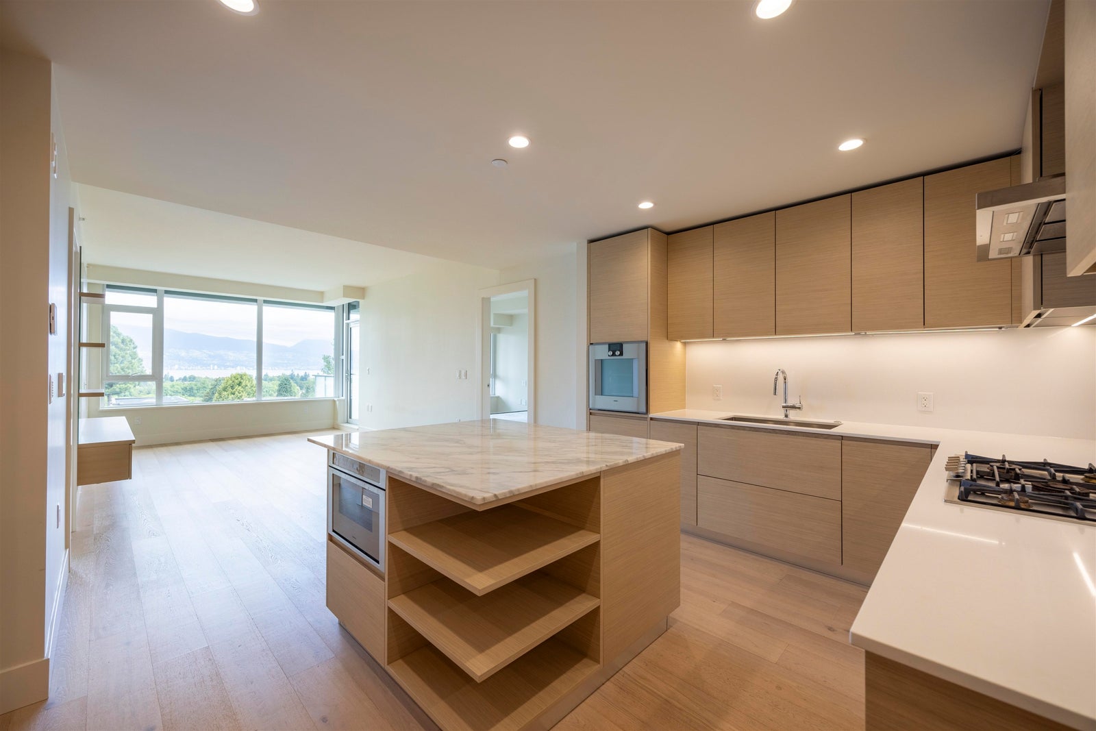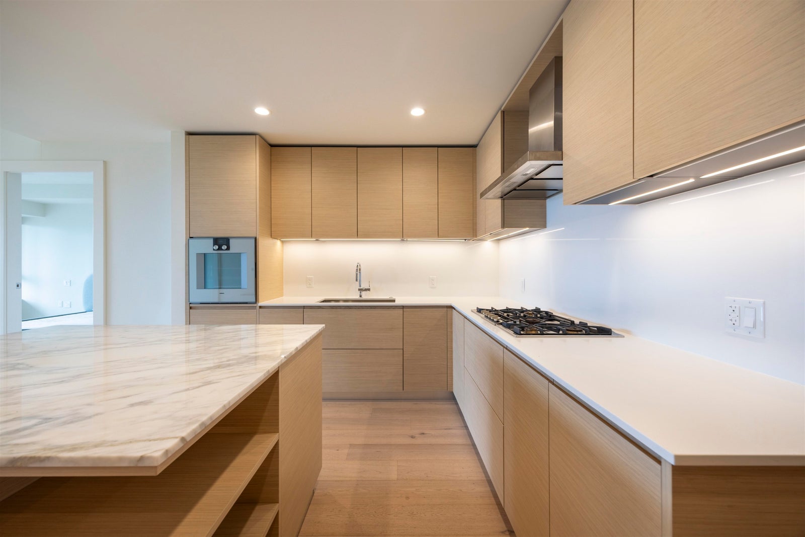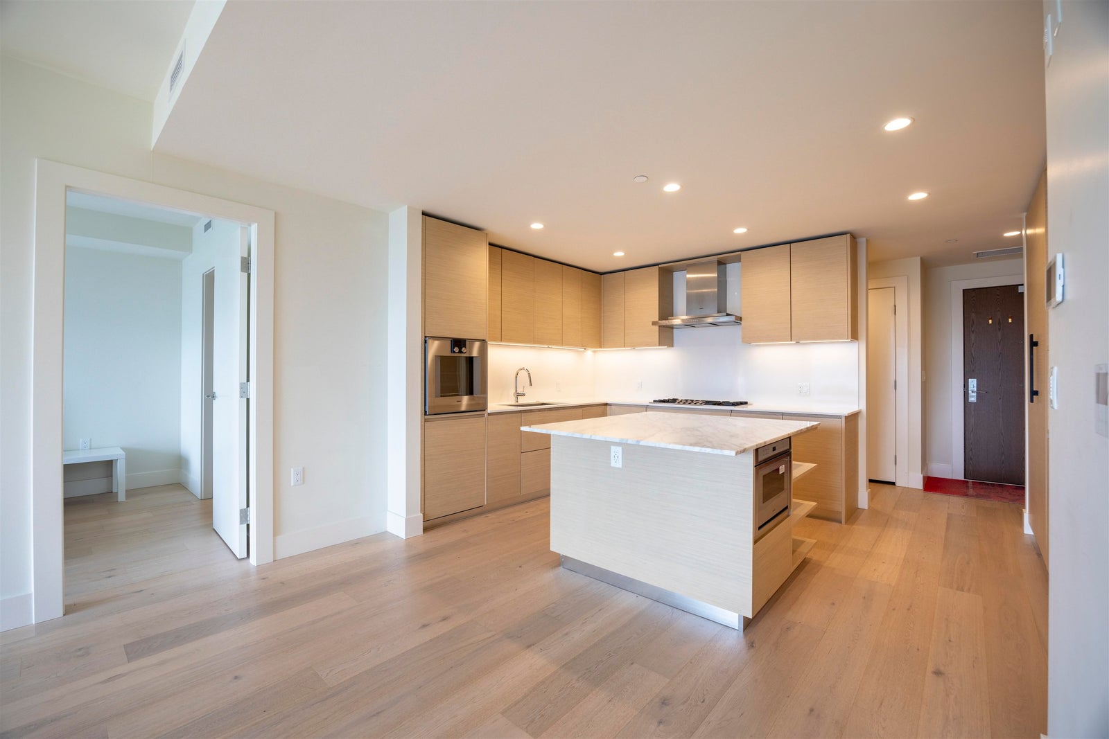 Breathtaking views of the ocean and mountains await in this elegant 2-bedroom+ flex suite, offering refined comfort and functionality. Stay cool year-round with integrated A/C and enjoy premium wide-plank hardwood flooring throughout. The gourmet Italian kitchen boasts exquisite oak cabinetry, a sleek island, and top-tier Gaggenau appliances. Spa-like master ensuite showcases imported Italian marble tiles, Nu-heat in-floor heating, and a sculptural free-standing bathtub. Smart-home technology, full-sized side-by-side laundry, and meticulous finishings enhance everyday living. Comes with two parking stalls and two storage lockers. Residents enjoy hotel-style amenities including a full-time concierge, well-equipped fitness studio, and a spacious lounge. Open House: Sun (Aug 17), 2-4pm.