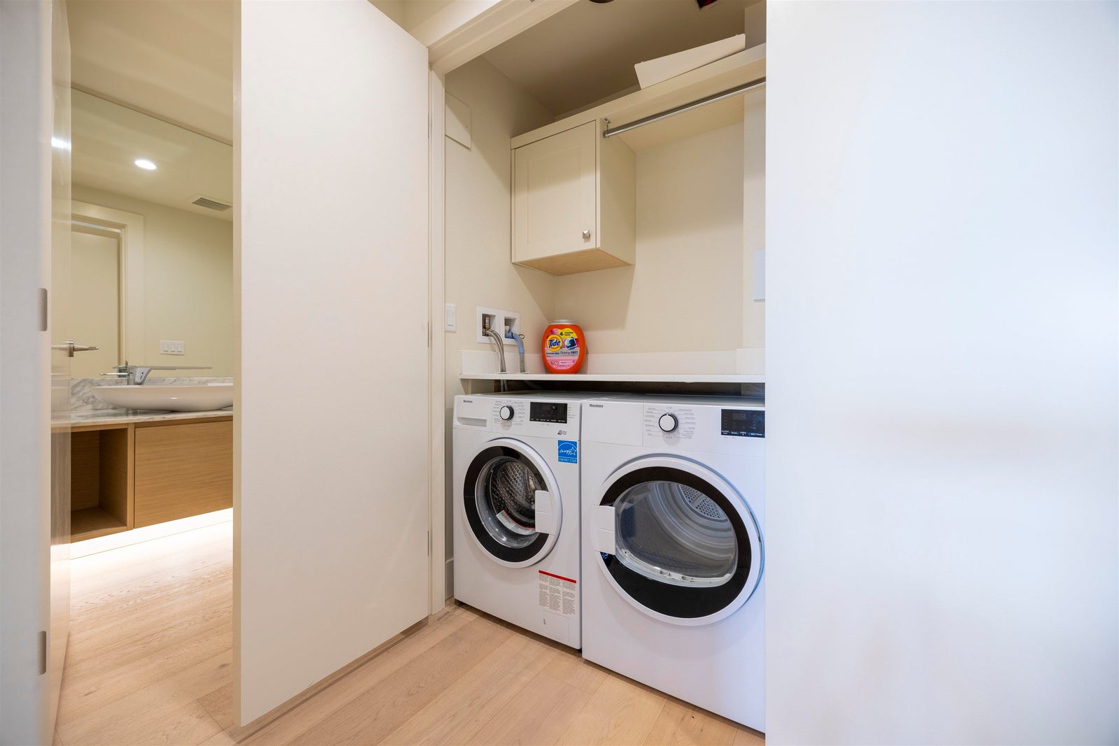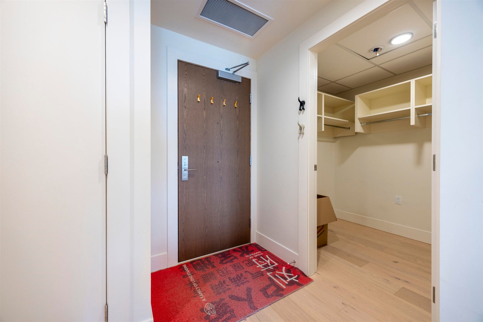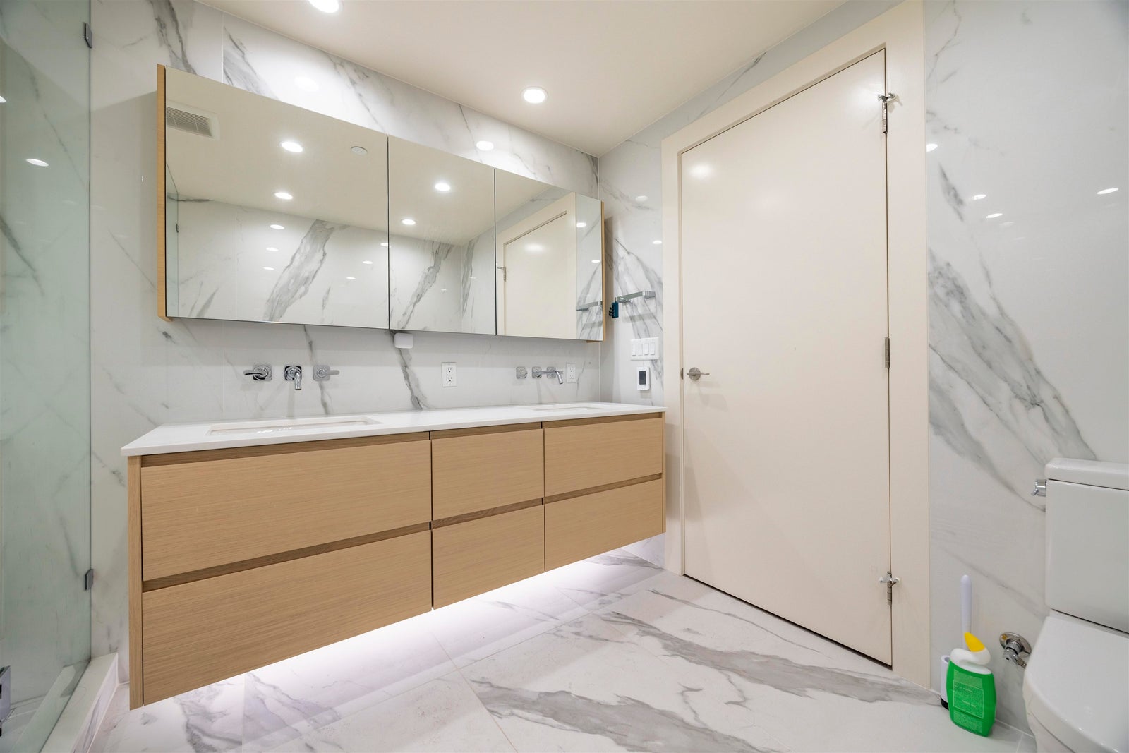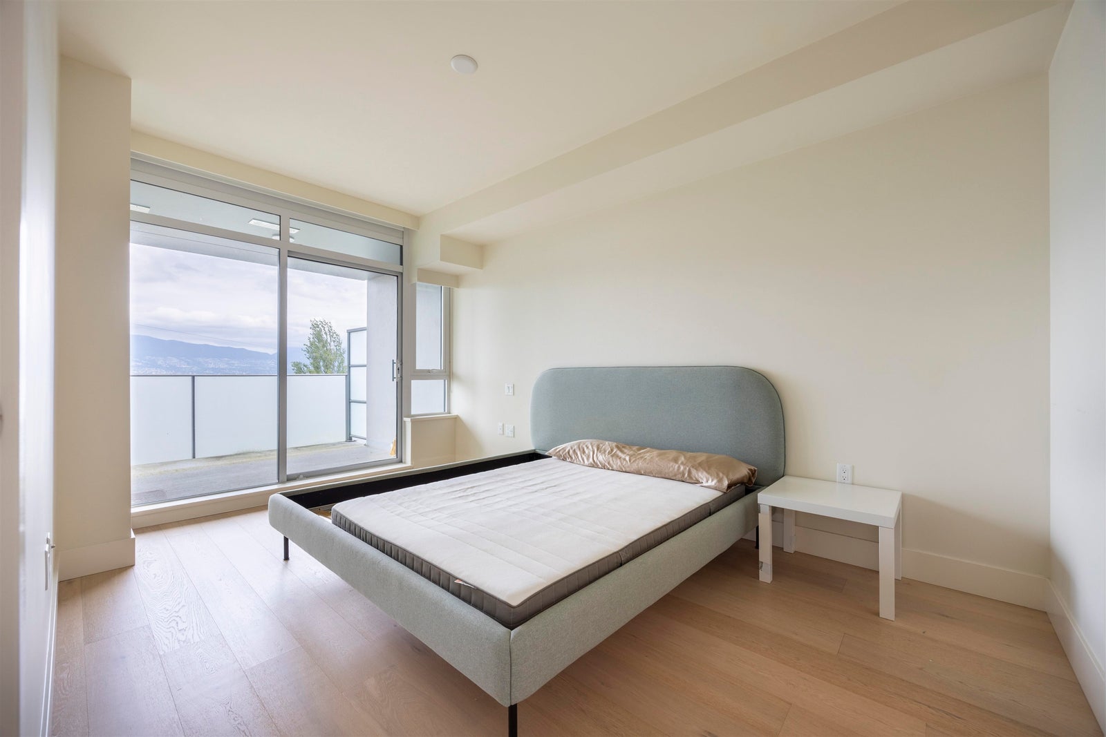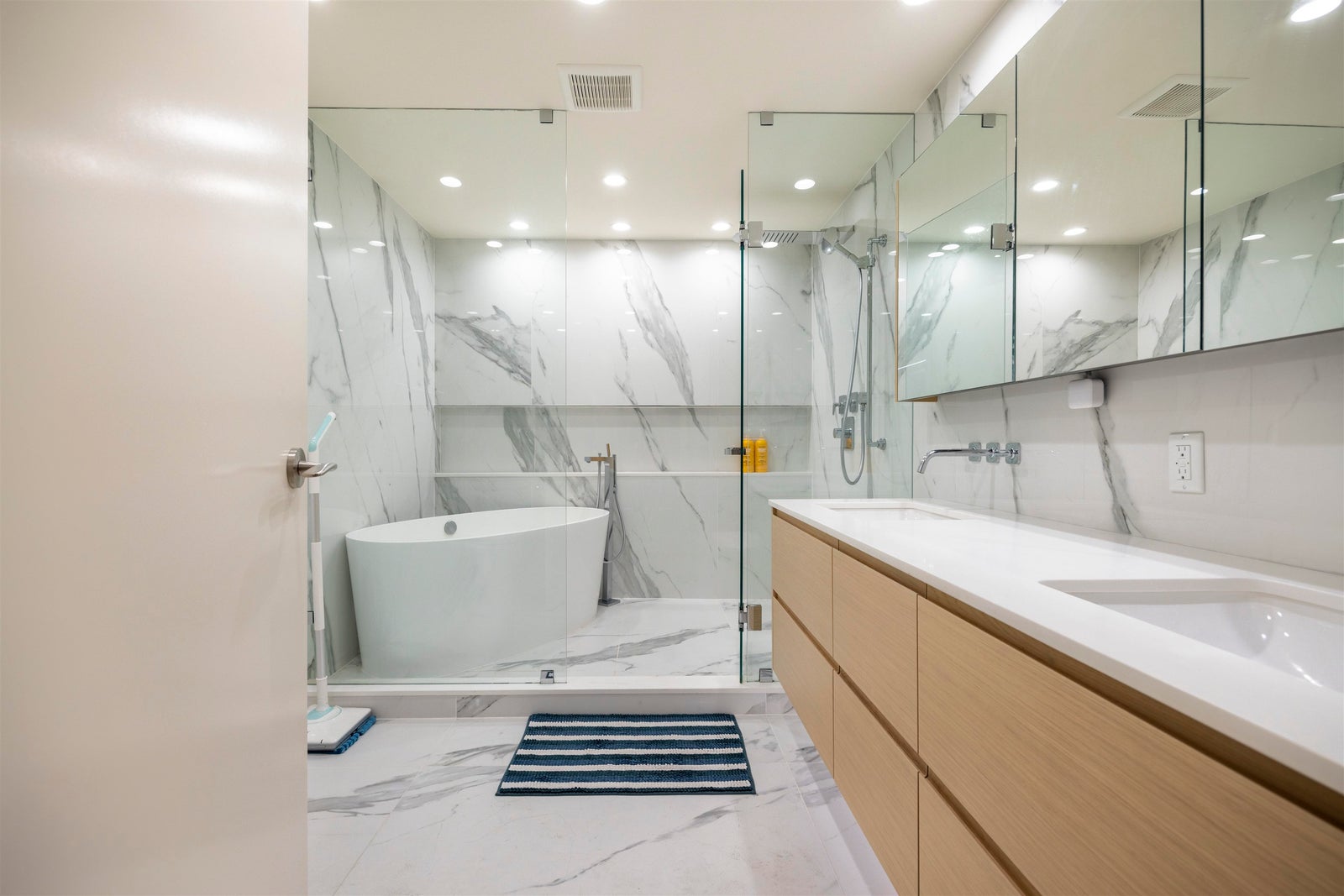 Breathtaking views of the ocean and mountains await in this elegant 2-bedroom+ flex suite, offering refined comfort and functionality. Stay cool year-round with integrated A/C and enjoy premium wide-plank hardwood flooring throughout. The gourmet Italian kitchen boasts exquisite oak cabinetry, a sleek island, and top-tier Gaggenau appliances. Spa-like master ensuite showcases imported Italian marble tiles, Nu-heat in-floor heating, and a sculptural free-standing bathtub. Smart-home technology, full-sized side-by-side laundry, and meticulous finishings enhance everyday living. Comes with two parking stalls and two storage lockers. Residents enjoy hotel-style amenities including a full-time concierge, well-equipped fitness studio, and a spacious lounge. Open House: Sun (Aug 17), 2-4pm.