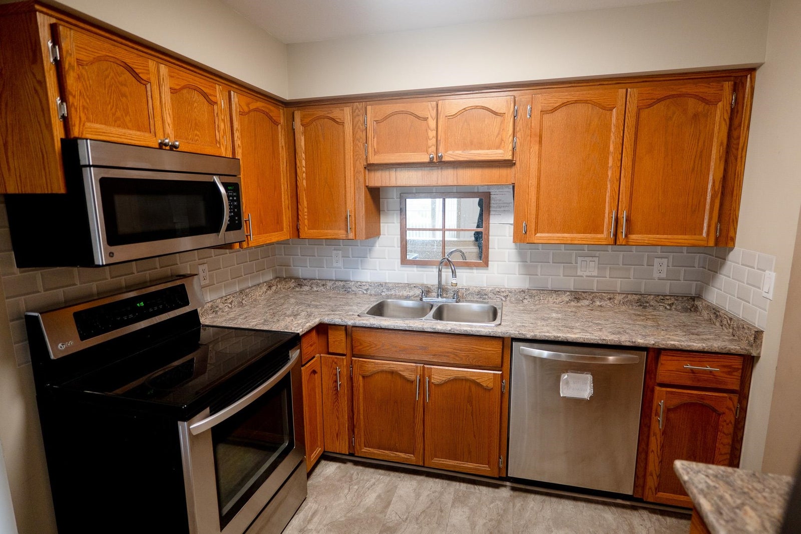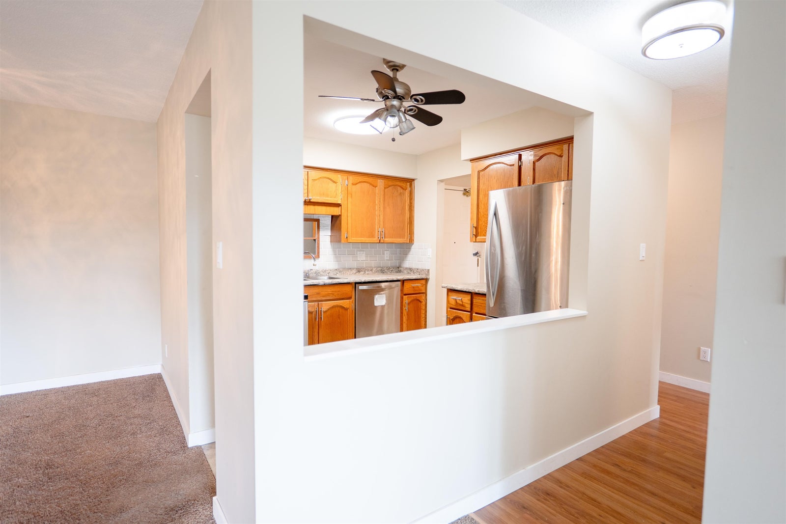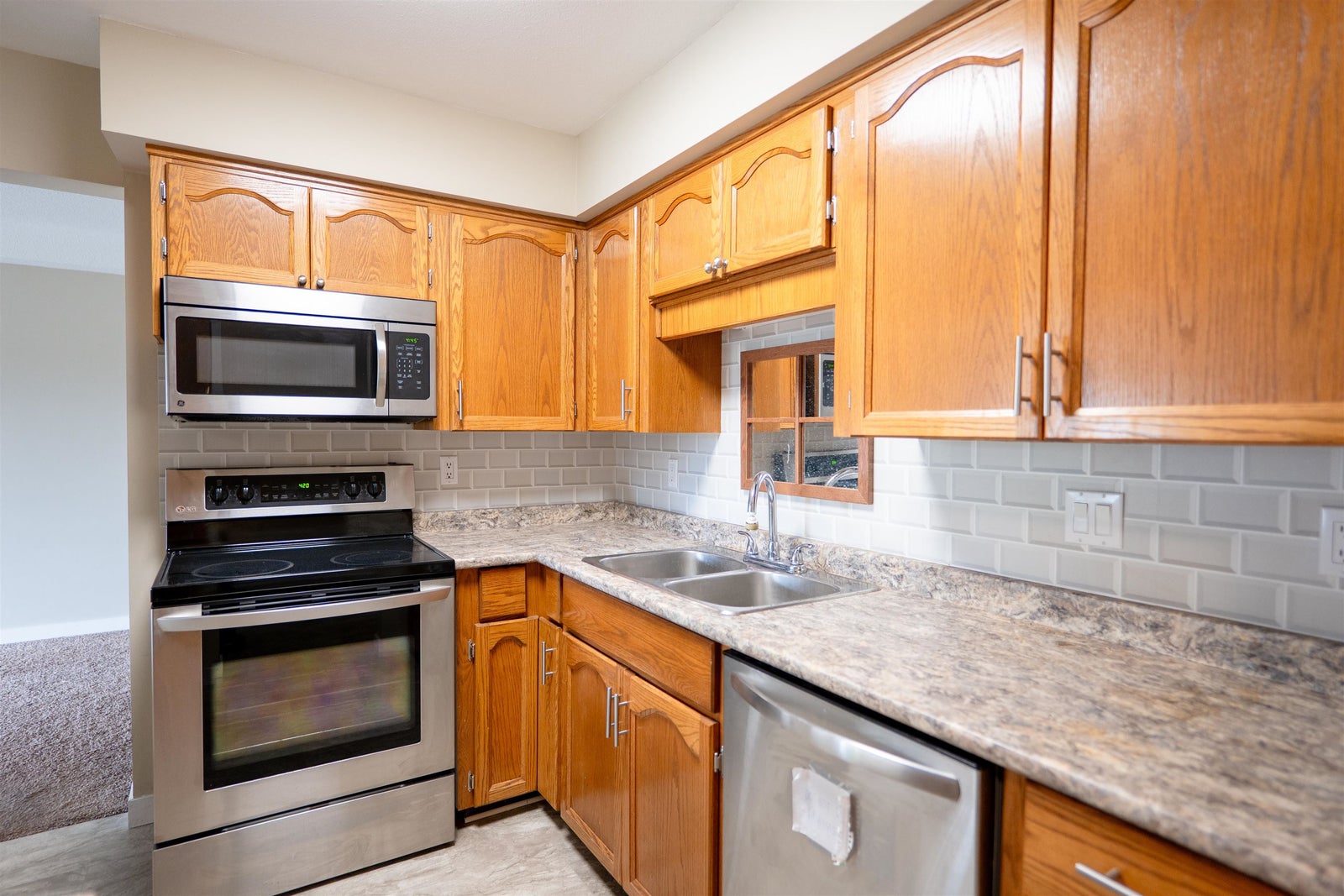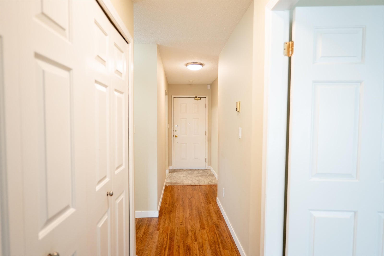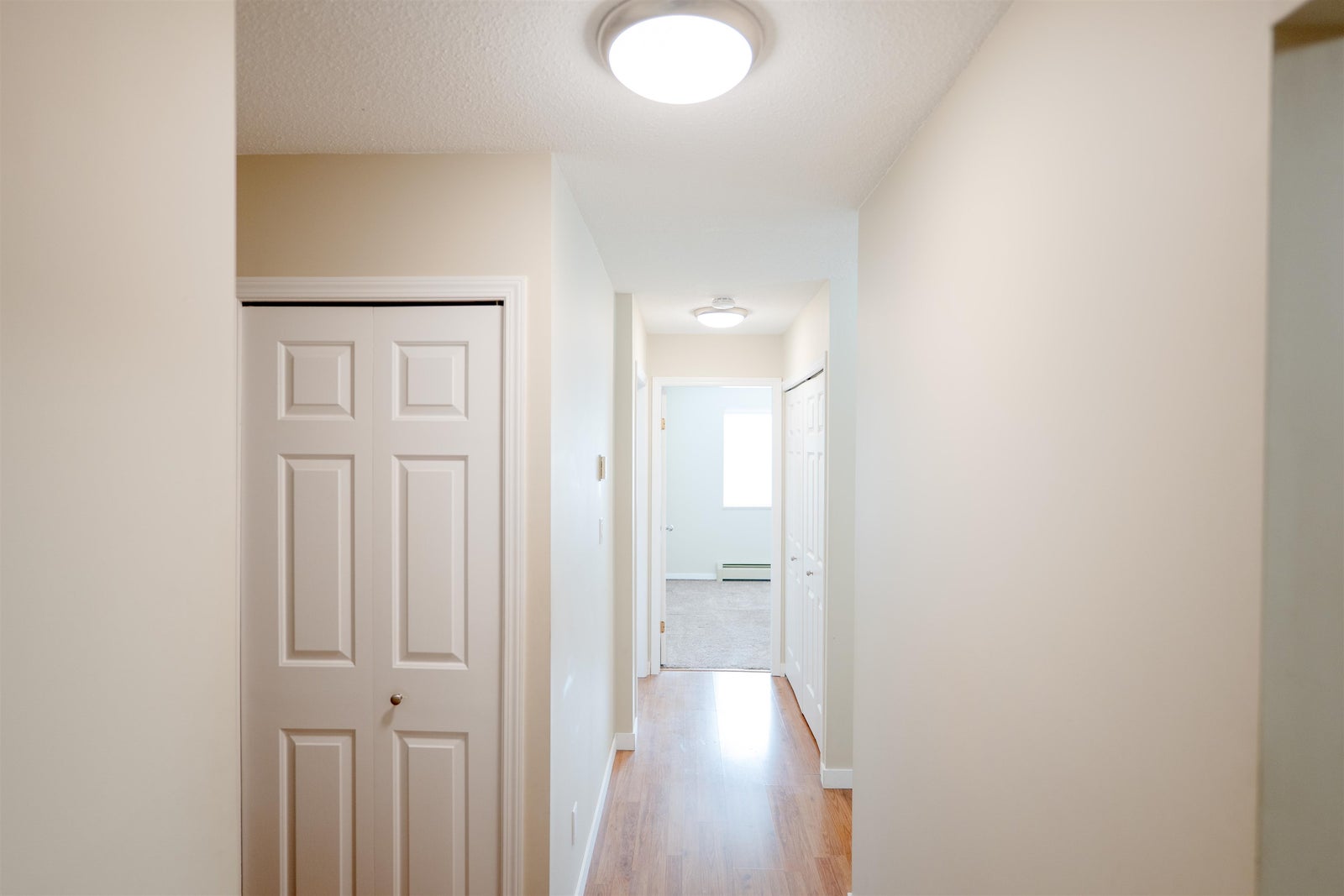 Well maintained and affordable retirement condo, 55+ age restriction. Refinished kitchen cabinets, new countertops, sink and taps as well as flooring, bathroom tub and surround and light fixtures have all been upgraded. Clean and well cared for, this is a delightful unit, set in a convenient location close to shopping. The hot and cold water lines have all been replaced in the entire building. Low strata fees include heat, water and hot water. This complex is well managed and has large storage unit, workshop, games room and meeting room. Roof and boiler have been recently replaced.