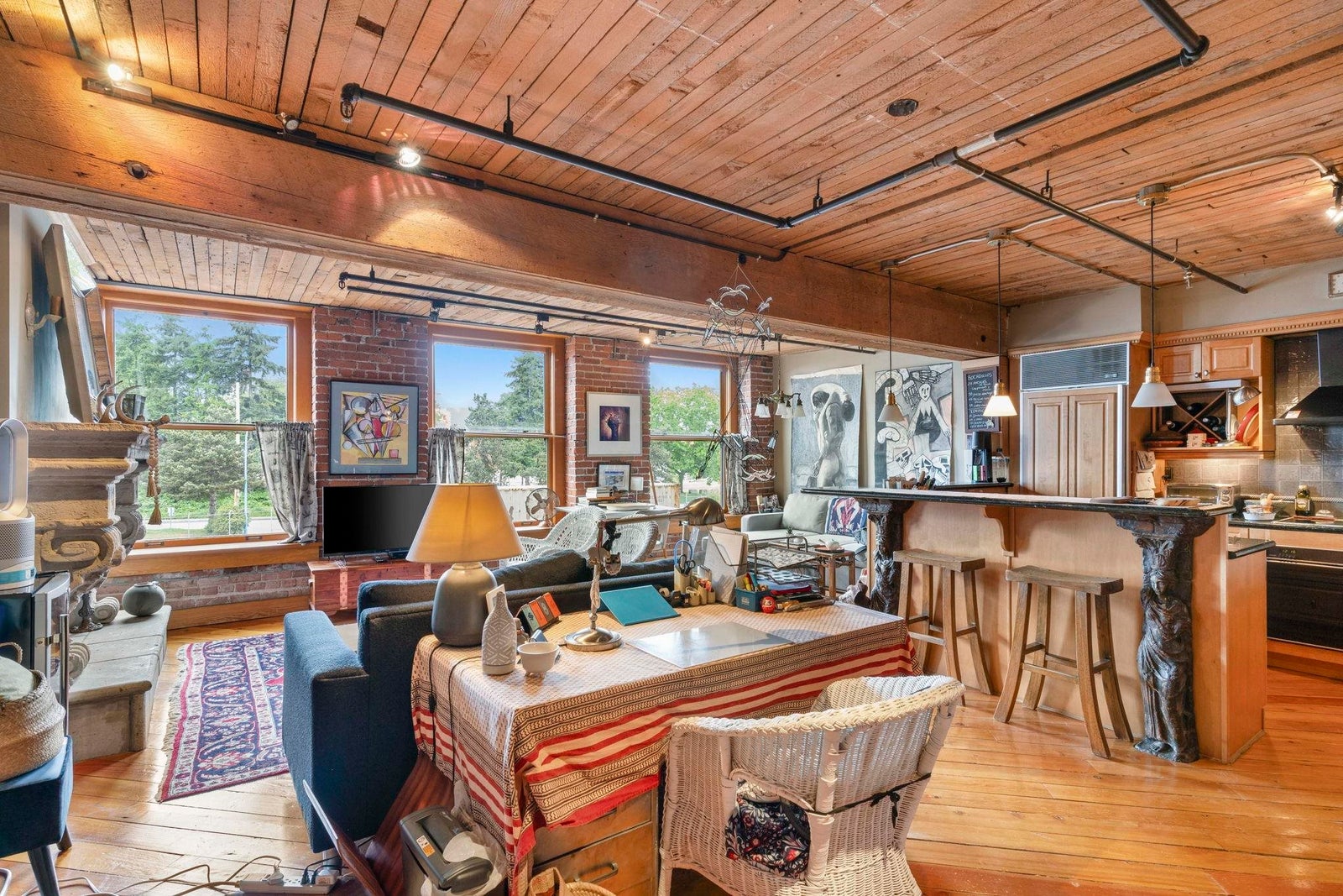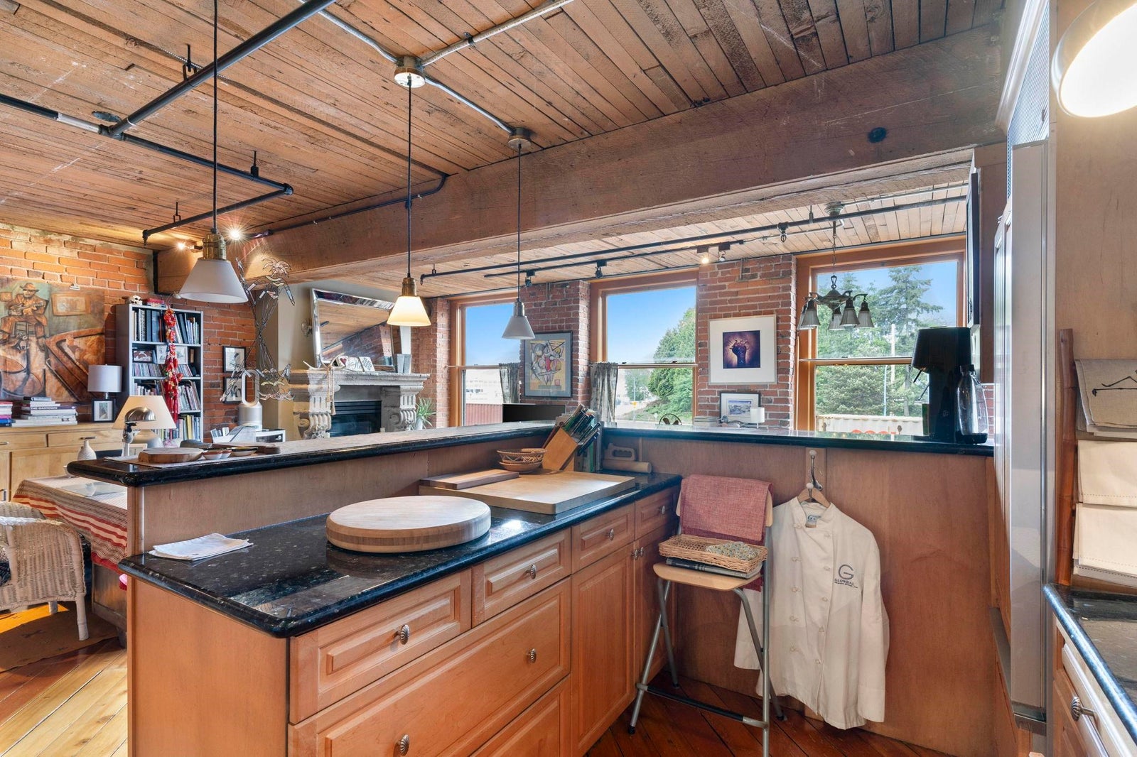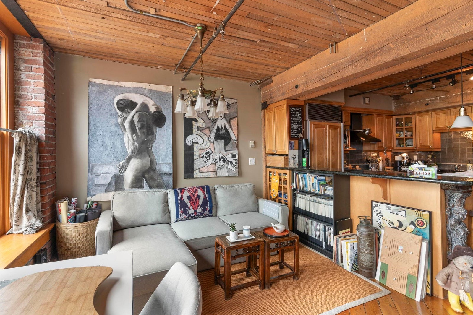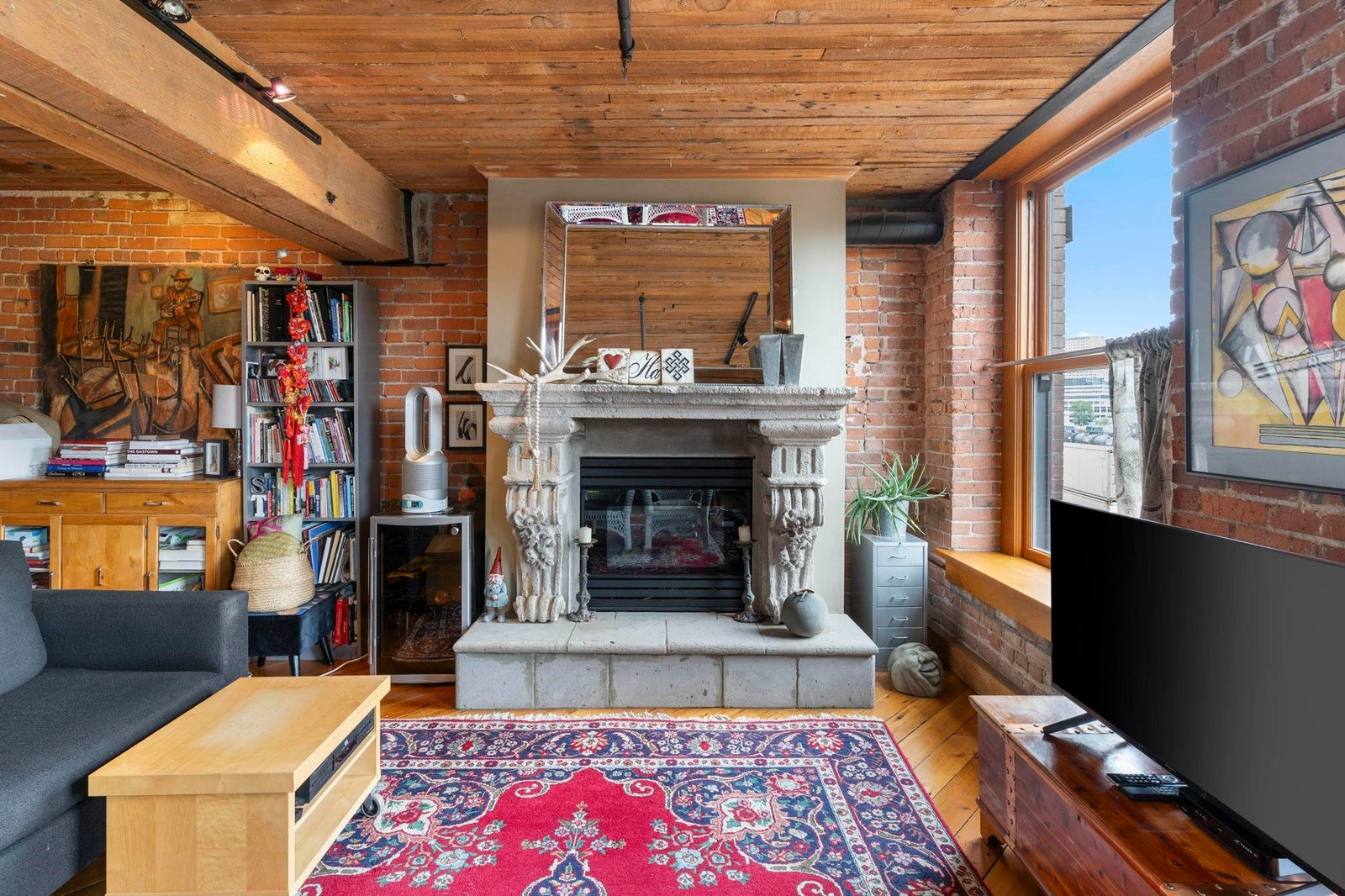In vibrant Gastown, The Captain French offers a unique blend of heritage architecture and modern flair. This generously sized 1 bedroom loft showcases timeless details brick feature walls, exposed wood beams, rich flooring that add depth and personality. Oversized windows capture panoramic views of the mountains, adding natural beauty to the everyday. The open concept living area includes a gas fireplace for cozy evenings, while the kitchen offers great layout with a breakfast bar and plenty of counter space. Whether it's a quiet workspace, extra storage, or a reading retreat, the flexible layout delivers. All of this just steps from Gastown cafes, boutiques and more. Residents enjoy access to a rooftop patio with BBQ, secure underground parking and a spacious storage locker.