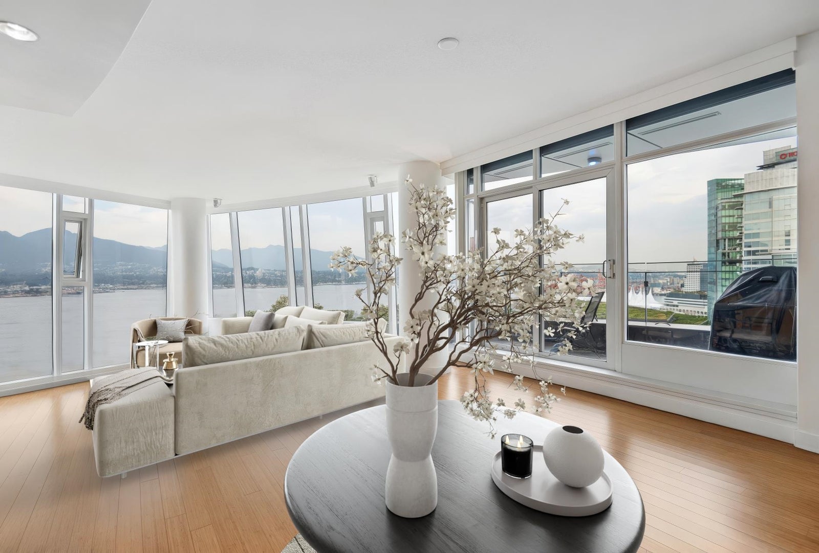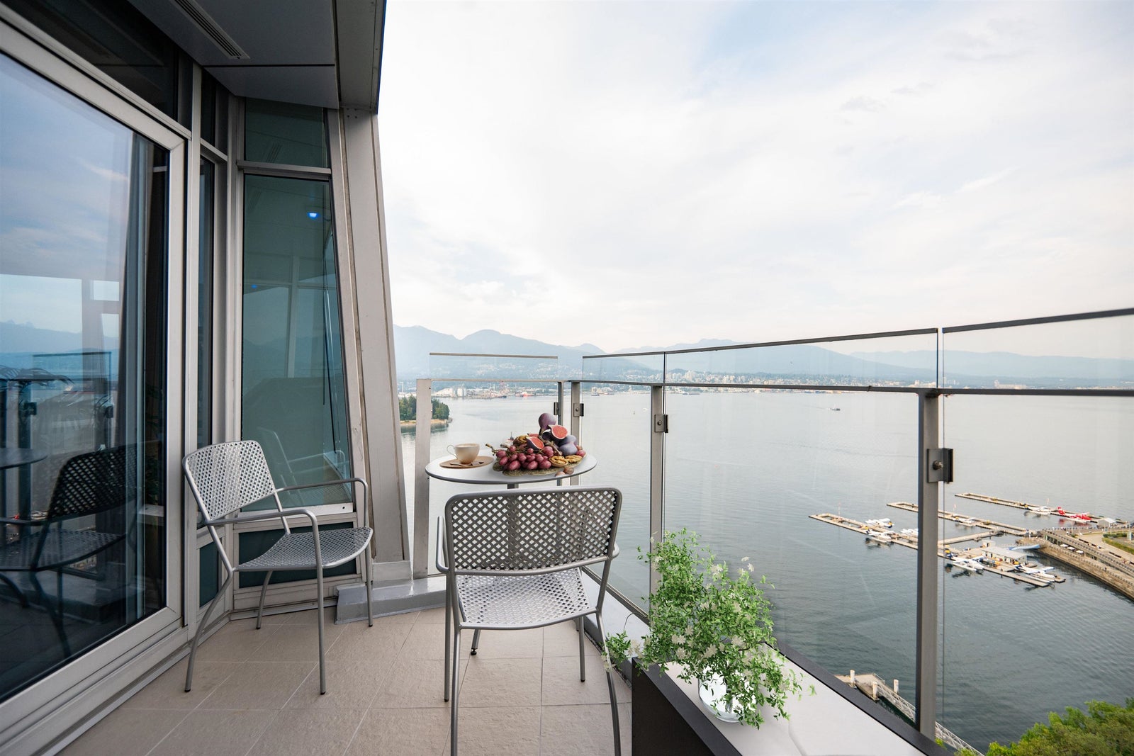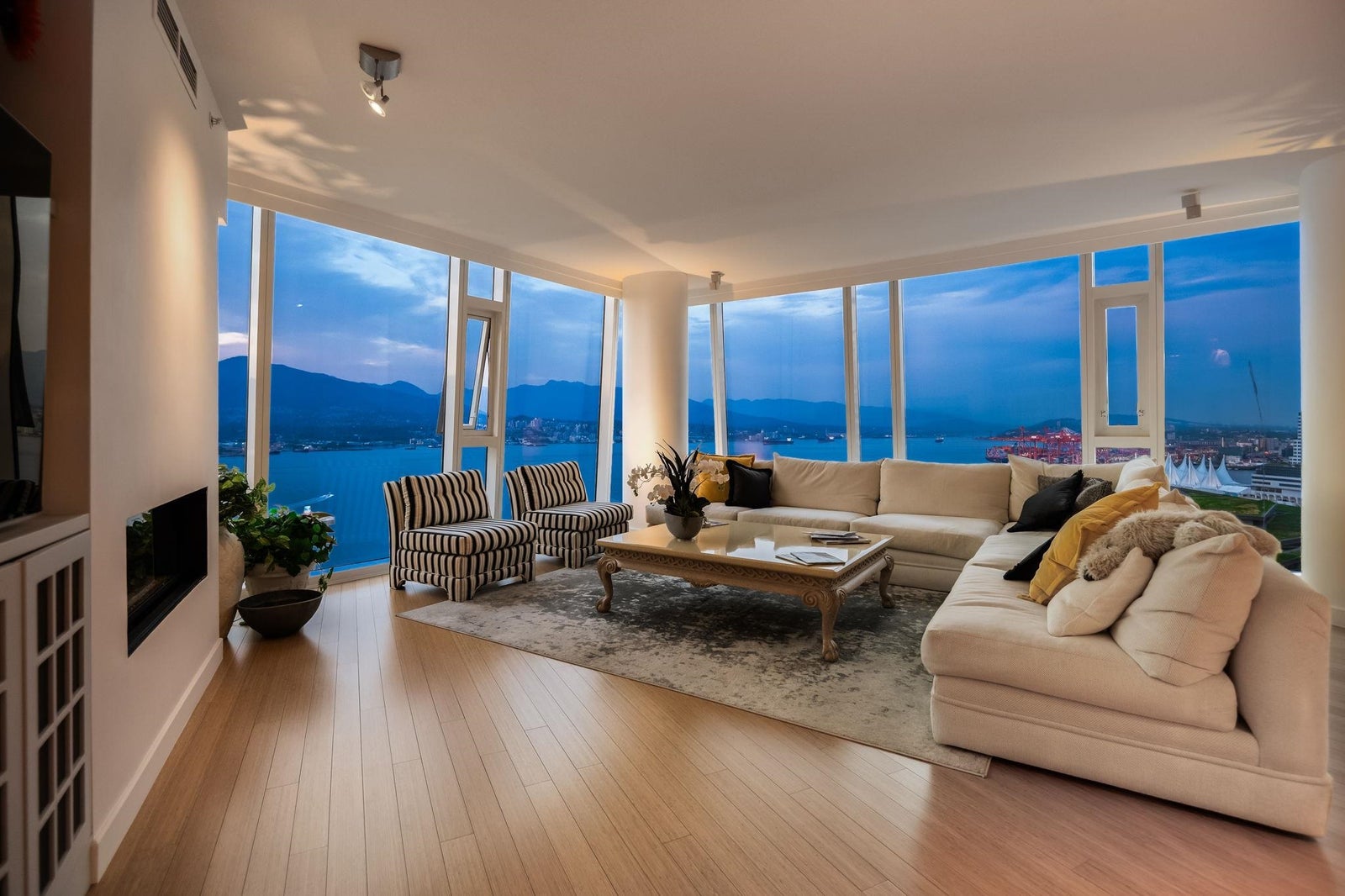 Gorgeous sub-penthouse at Carina in prestigious Coal Harbour, occupying the entire half floor with breathtaking views of the North Shore Mountains, Burrard Inlet, and Stanley Park. This 2,550 sq ft, 3-bedroom, 3-bath residence features floor-to-ceiling windows, expansive wrap-around terraces, central A/C, gas fireplace, gourmet kitchen with gas cooking, electric blinds, and patio awnings. Immaculately maintained by the original owner, the home is in pristine condition and offers 3 secure parking stalls and a storage locker. Carina provides resort-style amenities including an indoor pool, hot tub, sauna/steam, fitness centre, concierge, and meeting rooms, with generous visitor parking. Pets and rentals allowed with restrictions.